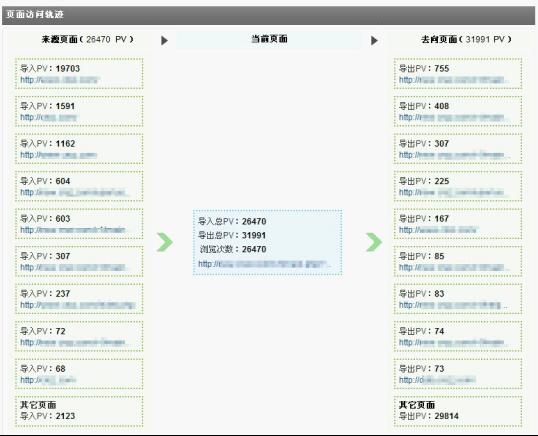 訪客經(jīng)常在網(wǎng)站中的各個頁面之間跳轉,訪問的路徑不勝枚舉,但可以通過觀察焦點頁面及其上下游頁面,掌握訪客的來路和去向,發(fā)現(xiàn)較普遍的訪客訪問習慣。頁面訪問軌跡即用來完成該功能,用戶可自由指定觀察焦點頁面,系統(tǒng)會列出該頁面的前十位來路頁面和去向頁面。對觀察焦點頁面而言,其自身的導入、導出PV的多少能夠反映出該頁面在網(wǎng)站的權重地位,而通過觀察來源和去向頁面又能最大限度的了解到訪客的行為習慣及興趣點。